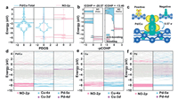 To reveal the underlying physics of the NO adsorption and activation, we investigated the projected density of states (PDOS), the projected crystal orbital Hamiltonian population (-pCOHP) [54], the differential charge density, and the band structure of the catalysts (Figs. S8-S13 in Supporting information). We take Pd/Cu as an example, after NO adsorption, the NO's π* orbital near the Fermi level (EF) hybridizes with the orbitals of Pd/Cu, leading to the formation of the partially occupied π* orbital of NO (Fig. 2a). The electron injection from SAAC surface to NO weakens the N—O bond, which is further proved by the increased value of integrated crystal orbital Hamilton populations (ICOHP) after NO adsorption (Fig. 2b).