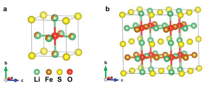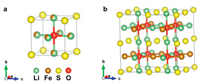 | Fig. 1. (a) Structure of the primitive cell of Li2FeSO with mixed occupancy of Li and Fe. (b) Ground state structure of the 2 × 2 × 2 supercell of Li2FeSO. | |