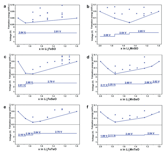 By combining preliminary Ewald energy calculations with precise DFT calculations, we characterized the LixFeSO mesophase for Li2FeSO within the range of 1 < x < 2. The stable phase between LiFeSO and Li2FeSO in the phase diagram was determined by calculating the convex hull. As shown in Fig. 2a, Li2FeSO exhibits two distinct voltage platforms, which are consistent with experimental observations. Specifically, for the range of 1.875 < x < 2, the voltage is 2.64 V vs. Li/Li+, aligning with the experimental charging at 2.5 V vs. graphite [9]. However, for the range of 1 < x < 1.875, the voltage increases to 2.81 V. The average voltage for the removal of half Li is 2.79 V, slightly exceeding the experimental value. This variance may be attributed to structural changes occurring after the Li removal. Expanding our investigation to explore the convex hull and voltage profiles for Li2FeSeO and Li2SeTeO, we observed multiple voltage platforms (Figs. 2c and e). The average voltages for Li2FeSeO and Li2FeTeO are 2.72 V and 2.58 V, respectively. These results indicate that replacing S with Se and Te leads to a reduction in voltage for Li2FeSO.