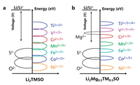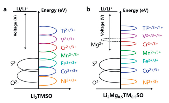 | Fig. 5. Schematic diagram of the relationship between electron orbital energy levels and the voltage. (a) Li2TMSO. (b) Li2Mg0.5TM0.5SO. | |