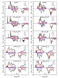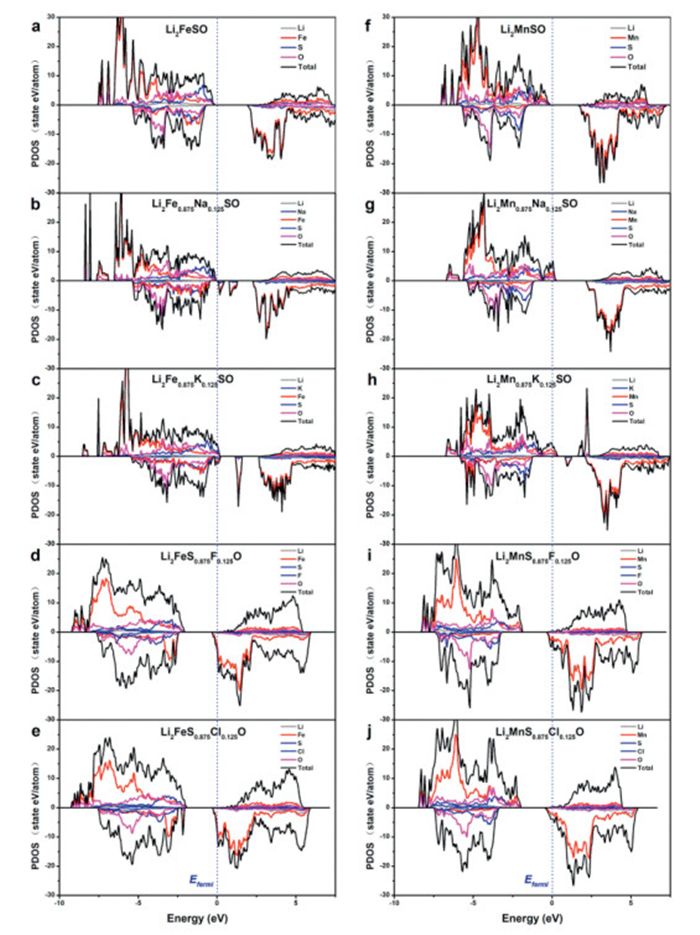 | Fig. 7. Density of states for (a) Li2FeSO, (b) Li2Fe7/8Na1/8SO, (c) Li2Fe7/8K1/8SO, (d) Li2FeS7/8F1/8O, (e) Li2FeS7/8Cl1/8O, (f) Li2MnSO, (g) Li2Mn7/8Na1/8SO, (h) Li2Mn7/8K1/8SO, (i) Li2MnS7/8F1/8O, and (j) Li2MnS7/8Cl1/8O. | |