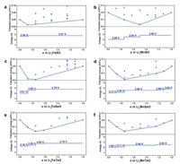 | Fig. 2. Theoretical voltage curves for (a) Li2FeSO, (b) Li2MnSO, (c) Li2FeSeO, (d) Li2MnSeO, (e) Li2FeTeO and (f) Li2MnTeO. | |