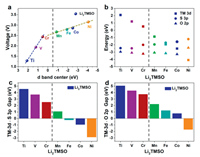 | Fig. 4. (a) Correlation between the TM-3d band center energy level and the voltage for Li2TMSO. (b) The TM-3d, S-3p, and O-2p band center energy levels in Li2TMSO. (c) Energy level differences between TM-3d and S-3p orbitals. (d) Energy level differences between TM-3d and O-2p orbitals. | |