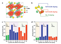 | Fig. 6. (a) The 2 × 2 × 2 supercell structure of Li2FeSO and Li2MnSO. (b) Li migration bottleneck, composed of two S atoms, two TM atoms, and one O atoms. Strategies for S-site doping, O-site doping, and TM-site doping are provided. (c, d) Li migration energy barriers with different element doping in Li2FeSO and Li2MnSO, with black dotted lines denoting the migration barriers of undoped Li2FeSO and Li2MnSO. | |