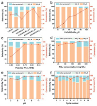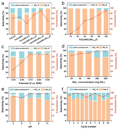 | Fig. 2. (a) Nitrate conversion rate and product selectivity of different electrocatalyst materials under −0.74 V (vs. RHE) for 12 h. (b) The change of nitrate, nitrite, and ammonium ion concentrations with time during the electrocatalysis of FeCoNiCuRu1.5/C. (c) The electrocatalytic nitrate reduction performance of FeCoNiCuRu1.5/C under different pH. (d) The electrocatalytic nitrate reduction performance of FeCoNiCuRu1.5/C at different applied potential. (e) The electrocatalytic nitrate reduction performance of FeCoNiCuRu1.5/C at different initial nitrate concentration. (f) Nitrate conversion and selectivity over FeCoNiCuRu1.5/C in 10 cycles. | |