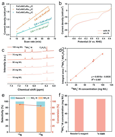 | Fig. 3. (a) CDL values of high-entropy nanoalloy materials with different Ru content. (b) LSV curves of FeCoNiCuRu1.5/C electrocatalyst in the presence and absence of nitrate. (c) The 1H NMR spectra using series of 15NH4-N solution with known concentration as standards in 0.1 mol/L Na2SO4. (d) Calibration curves of 15NH4-N. (e) NO3RR performance using 14N and 15N as N source over FeCoNiCuRu1.5/C respectively, respectively. (f) Comparison of different methods to detect ammonia from electroreduction of nitrate. | |