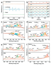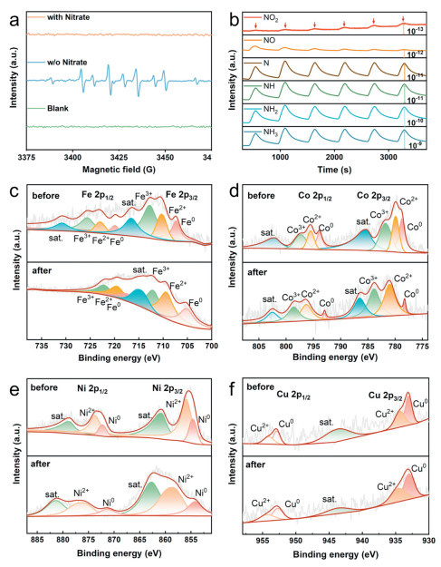 | Fig. 4. (a) Electron spin resonance (ESR) test of FeCoNiCuRu1.5/C electrocatalyst at −0.74 V (vs. RHE). (b) Differential electrochemical mass spectrometry (DEMS) of FeCoNiCuRu1.5/C electrocatalyst. (c-f) X-ray photoelectron spectroscopy (XPS) spectra of FeCoNiCuRu1.5/C before and after the reaction. | |