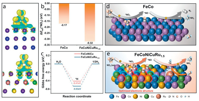 | Fig. 5. (a) Charge density difference profiles for NO3− adsorption on FeCo and FeCoNiCuRu1.5. (b) The absorption energy of NO3- on FeCoNiCuRu1.5 and FeCo surface. (c) Gibbs energy profile of FeCoNiCuRu1.5 and FeCoNiCu for HER. (d, e) The process of nitrate reduction to ammonia on the surface of FeCo and FeCoNiCuRu1.5, respectively. | |