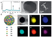 | Fig. 1. (a) XRD pattern of FeCoNiCuRu1.5/C. (b, c) TEM images of FeCoNiCuRu1.5/C. (d) Model diagram of FeCoNiCuRu1.5/C nanoparticle and EDX elemental mapping of Fe, Co, Ni, Cu and Ru elements of FeCoNiCuRu1.5/C. | |
