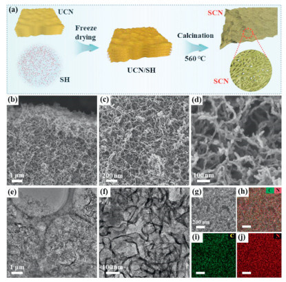 | Fig. 1. (a) Illustration of the synthetic process of SCN sample. (b–d) Field emission scanning electron microscopy (FESEM), (e, f) TEM images and (g–j) elemental mapping images of SCN. | |