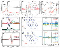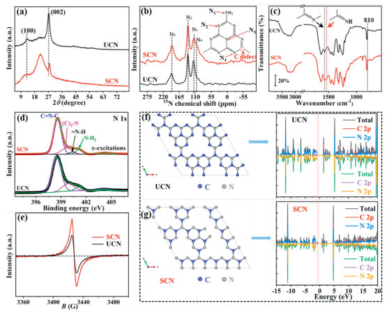 | Fig. 2. (a) XRD, (b) 15N cross‐polarization solid-state NMR, (c) FT-IR, (d) HR-XPS, and (e) EPR spectra of SCN and UCN. The optimized structures together with corresponding spin-polarized total density of states (TDOS) and partial density of states (PDOS) plots of (f) UCN and (g) SCN, respectively. | |