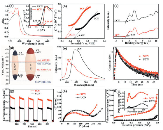 | Fig. 3. (a) UV–vis absorption spectra (inset: bandgap plot), (b) Mott-Schottky plots, (c) XPS valence band spectra, (d) band structure, (e) fluorescence spectra, (f) TRPL spectra, (g) transient photocurrent response curves, (h) electrochemical impedance spectra and (i) N2 adsorption-desorption isothermal curves (inset: pore size distribution) of SCN and UCN. | |