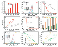 | Fig. 4. (a) Photocatalytic H2 production rates coupled with degradation of RhB over SCN and UCN. (b) Photocatalytic degradation spectra of RhB in SCN system. (c) Photocatalytic degradation rates of RhB and (d) rate constants after quasi-primary kinetic simulations. (e) Apparent quantum efficiencies of photocatalytic H2 production coupled degradation of RhB over SCN under monochromatic illumination at 380 nm, 400 nm and 450 nm, respectively. (f) Photocatalytic hydrogen production rates coupled degradation on SCN + Pt (3% Pt) and UCN + Pt (3% Pt) samples in RhB solution. (g) Photocatalytic degradation of RhB spectra in SCN + Pt system, and corresponding (h) photocatalytic degradation rate of RhB and (i) rate constants after quasi-primary kinetic simulations. | |