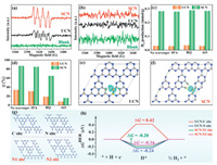 | Fig. 5. EPR signals of DMPO-•O2− adducts in SCN and UCN (a) in atmospheric environments and (b) in photocatalytic H2 production coupled with RhB degradation system. (c) Photocatalytic hydrogen production rate and (d) RhB degradation efficiency of SCN and UCN after adding isopropanol, benzoquinone and oxalic acid, respectively. Charge density difference (the yellow and sky-blue color loops represent charge accumulation and depletion region) of (e) UCN and (f) SCN. (g) The optimized structures of the H atom adsorbed on C-site and N-site of UCN, and on N1-site and N2-site of SCN. (h) The HER reaction pathways at zero voltage on above optimized structures. | |