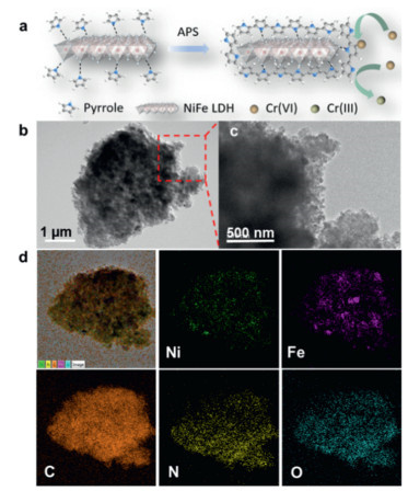 | Fig. 1. (a) Schematic illustration of the synthesis of PPy/LDH. (b, c) TEM images of PPy/LDH, and (d) EDS mapping of PPy/LDH. | |