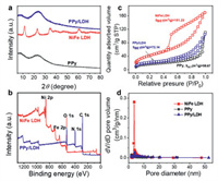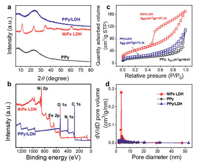 | Fig. 2. (a) XRD patterns of PPy/LDH with different composite proportions. (b) XPS spectra, (c) N2 adsorption/desorption isotherms and (d) pore-size distribution of NiFe LDH and PPy/LDH. | |