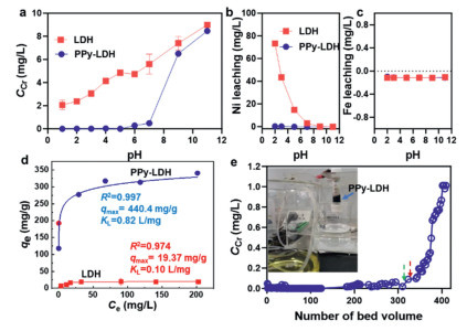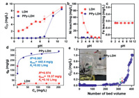| Fig. 3. (a) Adsorption removal of Cr(Ⅵ) by NiFe-LDH and PPy/LDH under pH 2.0 to 11.0. (b) Ni and (c) Fe leaching from NiFe-LDH and PPy/LDH under pH 2.0 to 11.0. (d) Adsorption isothermal kinetics of NiFe-LDH and PPy/LDH for Cr(Ⅵ) at pH 5.0. (e) Column adsorption operation of Cr(Ⅵ) at pH 5.0. Experimental conditions: [Cr(Ⅵ)] = 10 mg/L, [PPy/LDH] = 0.25 g/L, T = 25 ℃. | |