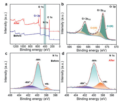 | Fig. 4. XPS characterization of PPy/LDH before and after Cr(Ⅵ) adsorption. (a) Survey spectra, (b) Cr 2p spectra, N 1s spectra of PPy/LDH (c) before and (d) after Cr(Ⅵ) adsorption. | |