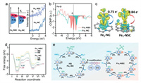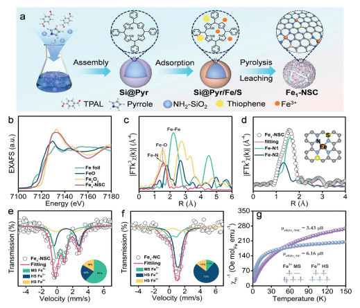 | Fig. 1. (a) Preparation procedure. (b) Fe K-edge XANES spectra. (c) FT-EXAFS spectra. (d) EXAFS fitting curves. (e, f) 57Fe Mössbauer spectra and (g) temperature-dependent magnetic susceptibilities of Fe1-NSC and Fe1-NC. | |
