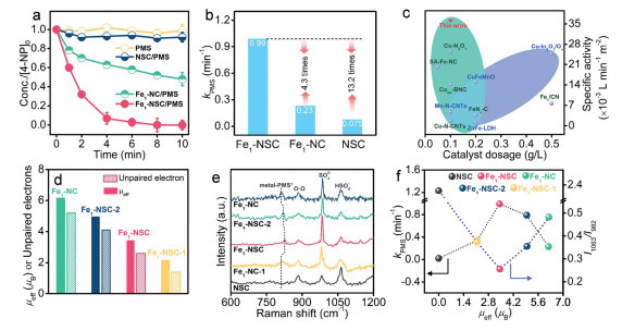 | Fig. 2. (a) Degradation performance of 4-NP. (b) The kinetic constant of PMS decomposition. (c) The comparisons of specific activity. (d) The magnetic moments. (e) In-situ Raman spectra of PMS adsorption. (f) The kinetics of PMS consumption and the ratio of I1063/I982 in Raman spectra over different systems. | |