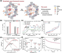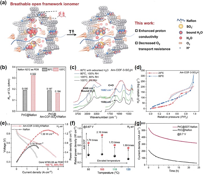 Recently, inspired by hyperthermophiles that maintain cell membrane hydration and gas exchange via α-aminoketone linkages osmolytes to thrive at 80 ℃ to 125 ℃, prof. Bo Wang et al. designed an interpenetrating network of α-amino ketone-linked COF (Am-COF) and Nafion, constructing a "breathable" conduction system, which allows oxygen to permeate freely through its porous structure while retaining water molecules necessary for proton conduction (Fig. 1a) [5]. Through a linker exchange method, imine-bonded COFs were transformed into α-amino ketone-bonded Am-COFs, introducing ordered one-dimensional nanochannels (e.g., Am-COF-3 with 2.8 nm pore diameter), and sulfonic acid groups were grafted onto the pore walls (Am-COF-3-SO3H), thereby achieving synergistic distribution of hydrophilic sites and pores. The proton transport resistance (RH+) of the CL with this Am-COF-3-SO3H and Nafion (Am-COF-3-SO3H/Nafion) decreases to 0.164 Ω at 105 ℃, representing a 49% reduction compared to pure Nafion (Fig. 1b). In addition, the carbonyl groups (C = O) of Am-COF and sulfonic acid groups (-SO3H) of Nafion collaboratively anchor water molecules via hydrogen bond networks, which can be comfirmed in-situ diffuse reflectance FT-IR spectroscopy (DRIFTS) at ~3450 cm−1 (Fig. 1c). As evidenced by the water sorption isotherms, the water sorption capacity of Am-COF-3-SO3H/Nafion increased with rising temperature (Fig. 1d). The open framework structure of Am-COF also provides channels for oxygen diffusion, effectively addressing the "water-oxygen competition" bottleneck. The mesoporous structure of Am-COF-3-SO3H/Nafion reduces the oxygen non-pressure-dependent resistance (RNP) from 45.9 S/m in Nafion to 7.6 S/m at 105 ℃, boosting the limiting current density by 2.16-fold.