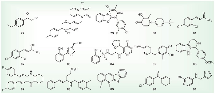 2.10. OthersSome structures with good antibacterial activity cannot be classified according to the active framework because of the few articles. Fig. 10 and Table 9 show some representative structures [139-153]. Chen et al. modified acetophenones and synthesized α-haloketone compound 77. The EC50 values of anti-Xoo and Xac were 0.09 and 0.16 µg/mL, respectively. The type of halogen atom at the α-position has a significant effect on the activity. At 50 µg/mL, compound 77 has excellent in vivo antibacterial activity against rice bacterial leaf blight, and its curative and protective activities are 48.9% and 52.1%, respectively [139]. Liu et al. modified the insecticide triflumezopyrim structure and found that the mesoionic compound 78 also has good antibacterial activity. At 200 µg/mL, the curative and protective activities of compound 78 against bacterial leaf blight were 72.04% and 75.12%, respectively [140]. Based on the structure of mesoionic compound 78, Liu et al. further modified the structure to obtain mesoionic compound 79. At 200 µg/mL, the curative and protective activities of compound 79 against rice bacterial leaf blight and bacterial leaf streak are 38.2%, 49.2% and 35.1%, 39.7%, respectively. Further, compound 79 is found to enhance SOD, PAL, CAT and oxidative phosphorylation pathways in rice, thereby improving disease resistance [141]. It shows that the mesoionic compound is a potential antibacterial agent structure. Yu et al. used antidesmone and maltol as leading structures to synthesize compound 80 with antibacterial activity. At 200 µg/mL, the curative and protective activities of compound 80 against bacterial leaf blight were 52.42% and 52.70%, respectively. It shows that pyridine-4(1H)-one may be a skeleton with antibacterial activity [142]. Sun et al. modified the structure of dehydrozingerone to obtain excellent antibacterial compounds 81 and 82. At 200 µg/mL, the protective activities of compounds 81 and 82 against rice bacterial blight can reach 51.7% and 57.4%. It shows that introducing the trifluoromethyl group at the α position of the carbonyl group can improve the antibacterial activity [143,144]. Li et al. modified the structure of the broad-spectrum antibiotic yanglingmycin and introduced a sulfur atom into the oxazole ring to obtain compound 83. The MICs of Rs and Pseudomonas syringae pv. actinidiae (Psa) were 3.91 and 7.81 µg/mL, respectively. Based on the relationship between structure and activity, oxazole rings containing hydroxyl groups are presumed to be the backbone of antibacterial activity [145]. Wu et al. found that compound 84 increased the SOD and CAT defense enzyme activities in rice, in addition, proteomics explains that compound 84 is resistant to Xoo invasion by upregating the photosynthetic pathway ATP synthase subunit d and the NADH dehydrogenase [ubiquinone] iron-sulfur 6 [146]. At a concentration of 10 µg/mL, compound 89 can inhibit the hpa1 of the T3SS at an inhibition rate of up to 86.4%, and it does not affect the growth of bacteria. In addition, the compound 89 can also effectively reduce the HR caused by Xoo in tobacco and decrease the pathogenicity of Xoo in rice [151]. The multifunctional supramolecular material containing compound 91 can effectively reduce the transcription of hrpG, hrpX, hrpE and hrpF in the T3SS, thereby resulting in the inhibition of the pathogenic ability of Xoo [153].