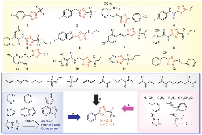 The modified active structural motifs of oxadiazole/thiadiazole compounds with antibacterial activities are shown in Fig. 2. According to the structural characteristics, oxadiazole/thiadiazole compounds are divided into four parts: A (aromatic ring), B (flexible chain), C (substituent) and sulfur bond. In part A, the antibacterial activity of aromatic rings is generally higher than that of alkyl or cycloalkanes. The aromatic rings are mainly heterocyclic rings containing N atoms and benzene rings. Among them, nitrogen-containing heterocycles are beneficial to improve water solubility, and improve the solubility of oxadiazole/thiadiazole compounds in water, thereby increasing antibacterial activity. Therefore, when designing part A, we can introduce structures such as quinazolines, alkaloids or phenolic acids to ensure that the activity is enhanced on the basis of increased water solubility. In part B, it is mainly the flexible chain connecting the aromatic ring and oxadiazole/thiadiazole, usually the chain of 0 to 3 carbon atoms has better antibacterial activity, and the continuous extension of the carbon chain is not conducive to the activity. The carbon atoms can be replaced with amide, amine, sulfonic acid and sulfone groups. We believe that the rational design of flexible chains has a significant influence on the antibacterial activity of oxadiazole/thiadiazole compounds. Therefore, when designing the structure, structures like isopropanolamine and esters can be introduced to improve the antibacterial activity. The introduction of small alkanes and halogenated alkanes in part C is more beneficial to the activity. The introduction of benzene and heterocyclic rings generally weakens the activity. In addition, the introduction of long-chain onium salts can also increase antibacterial activity. The sulfur between the oxadiazole/thiadiazole and part C has a vital biological activity for the compound. The antibacterial activity of the sulfone is significantly higher than that of the sulfoxide and thioether. We tried to separate oxadiazole/thiadiazole from sulfone with one or two carbon atoms, and found that the antibacterial activity decreased, indicating that the connection between oxadiazole/thiadiazole and sulfone is a necessary group for antibacterial activity. Although oxadiazole/thiadiazole compounds have excellent in vitro antibacterial activity, they do not have outstanding in vivo activity. We analyzed that the possible reasons might be the poor water solubility of oxadiazole/thiadiazole compounds and the relatively low stability after the splicing of the sulfonyl group and oxadiazole/thiadiazole. Therefore, when introducing the oxadiazole/thiadiazole structure, we should consider as much as possible how to increase water solubility and how to improve stability, which is beneficial to increasing the in vivo activity.