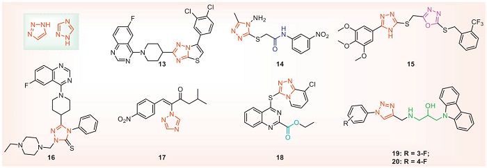 In the design of triazole antibacterial agents, the triazole part can be combined with hydrogen bonds, which is conducive to binding biomolecular targets and increasing solubility. Therefore, it is usually used as an active fragment to be spliced with natural products or lead structures with antibacterial activity. For example, compound 15 was obtained by concatenating oxadiazole and triazole, and compounds 16 and 18 were obtained by introducing quinazoline. Both carbon and nitrogen atoms of triazole can be structurally derived. The introduction of sulfur atoms and flexible chains such as isopropanolamine on the carbon atoms may help improve the antibacterial activity. At the same time, when designing new structures, the addition of triazole or triazole-containing condensed ring structures can be considered to improve antibacterial activity and water solubility. In addition, it is also a good choice to introduce triazole skeleton with antifungal activity into the structure of antibacterial activity. For example, compounds 19 and 20 introduce triazole containing isopropyl alcohol into carbazole, and the antibacterial activity is significantly increased.