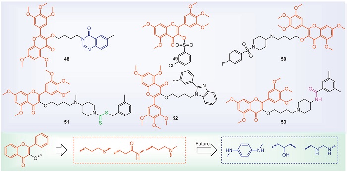 At present, the structural modification of flavonoids is mainly on the hydroxyl group at the 3-position of flavonoids. Introducing phosphate or sulfonate to improve antibacterial activity. The reason may be that the structure of flavonoids is relatively large and can be modified with alkyl chains. Alkyl chains containing amino groups have more advantages in antibacterial activity, which may be due to increased solubility. We suggest introducing isopropanolamine or ethylenediamine as bridge chains. In addition, we need to consider that the solubility of flavonoids is poor, and the bioavailability is not high. Retaining the hydroxyl groups on the flavonoids may improve antibacterial activity.