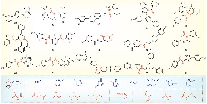 In the design of the amide structure with antibacterial compounds, in addition to the aromatic ring, one end of the carbonyl group in the amide can also be connected to an alkyl chain or heteroatoms, such as introducing Schiff bases and thioethers. Using amide as a bridge, introducing alkenyl, cyclopropane, or changing the amide to thioamide may improve the antibacterial activity. When we design antibacterial compounds, the introduction of amide backbone is often beneficial to improve antibacterial activity in vivo.