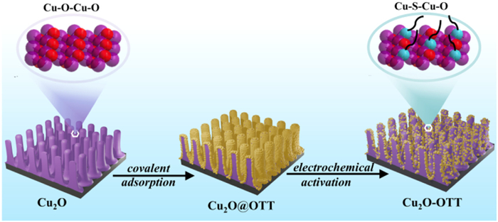 In general, the thiol end group are among the most stable, suggesting that, even under electrochemical reducing conditions, the ligand could remain chemisorbed to the catalyst surface. To address the simultaneous the requirements, we engineered a hierarchical Cu2O nanowires array with a thiol-modified surface (Fig. 1). Initially, copper hydroxide (Cu(OH)2) nanowires on Cu foam (Cu(OH)2 NWs) were prepared via a straightforward oxidizing process. After annealing under argon condition, these were transformed into Cu2O NWs, subsequently converted into OTT-Cu2O NWs array by simple wet-chemical adsorption combined with electrochemical activation strategies. As shown in Fig. S1 (Supporting information), for Cu2O NWs, SEM images feature its one-dimensional wire with a smooth surface, and the fine wire average diameter circa of 100 nm. Afterward, the resulting Cu2O NWs were immersed in an C2H5OH solution containing 1-octadecanethiol (OTT) for the synthesis of Cu2O@OTT, and then subjected to an electrochemical activation to remove excess weak molecular layer, leading to a strongly bonded OTT molecular surface on the one-dimensional wire (Cu2O-OTT), which feature asymmetric Cu–S–Cu–O sites for significantly enhancing CO2-to-C2H5OH conversion.