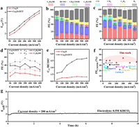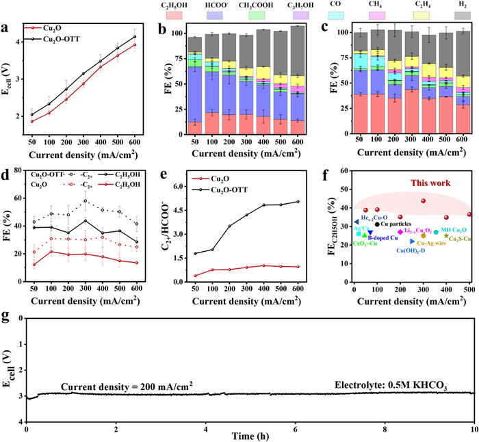 | Fig. 4. CO2RR performance in a MEA electrolyzer: (a) I-V curves of Cu2O and Cu2O-OTT; FE of products of the (b) Cu2O and (c) Cu2O-OTT. (d) FE of C2+ and C2H5OH. (e) Ratios of C2+ to-HCOO- for Cu2O and Cu2O-OTT. (f) Performance comparison of Cu-based catalysts for C2H5OH production by CO2RR pathway. (g) Stability test of Cu2O-OTT in 0.5 mol/L KHCO3 electrolyte. | |