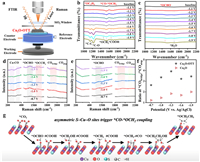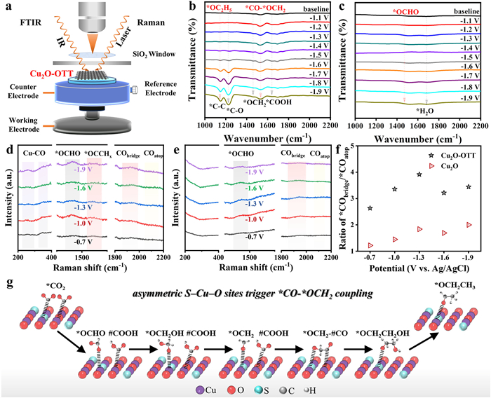 | Fig. 5. Mechanistic investigation: (a) The schematic illustration of in-situ FTIR and Raman electrolytic cell. (b, c) In-situ FTIR spectra at different potentials vs. Ag/AgCl. (d, e) In-situ Raman spectra at different potentials vs. Ag/AgCl. (f) The ratio of *CObridge to *COatop obtained from Raman spectra. (g) Schematic illustration for the catalytic mechanism for CO2RR to C2H5OH on Cu2O-OTT. | |