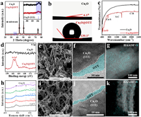 | Fig. 2. Composition and structure characterizations: (a) XRD pattern, (b) the contact angle, (c) FTIR spectra, (d) S 2p XPS spectra of Cu2O and Cu2O@OTT. (e) SEM image, (f) TEM image, (g) HAADF-STEM image of Cu2O@OTT. (h) In-situ Raman spectra of Cu2O@OTT at electrolysis from −1.6 V to −2.0 V vs. Ag/AgCl in CO2-saturated 0.5 mol/L KHCO3. (i) SEM image, (j) TEM image, (k) HAADF-STEM image of Cu2O-OTT. Equivalent images from i-to-k after electrolysis at –1.4 V vs. Ag/AgCl in CO2-saturated 0.5 mol/L KHCO3 for 30 min. | |