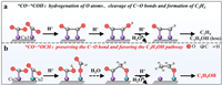 | Scheme 1. Poroposed reaction paths for yielding C2H4 vs. C2H5OH on the surface of (a) symmetric Cu1-Cu1 sites and (b) asymmetric Cu1-Cu2 sites in this work. | |
