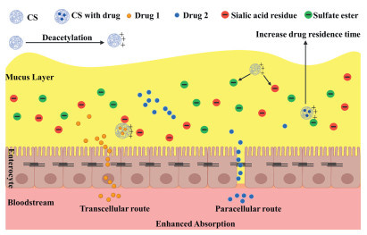2.1. Interaction with the intestinal mucosaCS has gained significant attention in the pharmaceutical field due to its exceptional mucoadhesive properties. This cationic polymer demonstrates a remarkable ability to interact with negatively charged mucosal surfaces found in various body parts, including the GIT, nasal passages, ocular surfaces, and other mucosal linings. The mechanism underlying this mucoadhesion primarily revolves around electrostatic forces. The mucoadhesive characteristics of CS enhance with the degree of deacetylation, as increased deacetylation leads to a bigger quantity of free amino groups in the polymer. The positively charged amino groups in CS engage in electrostatic interactions with the negatively charged sialic acid residues and sulfate esters found in mucosal glycoproteins. Hence, the higher the number of amino groups, the stronger the adhesion will be [44,45]. Additionally, hydrogen bonding and hydrophobic interactions play a crucial role in this process, enhancing the stability of the CS-drug complex at the mucosal surface. One of the most significant benefits of CS’s mucoadhesive properties is the increased residence time of drugs at their absorption sites (Fig. 1). By adhering to mucosal surfaces, CS prolongs the presence of the drug, allowing for an extended absorption period, which is crucial for improving the drug’s bioavailability [46-49]. This feature is especially beneficial for drugs that require prolonged contact with mucosal surfaces to achieve effective absorption. In addition to prolonging residence time, CS protects drugs from enzymatic degradation within the mucosa. It also facilitates the drug’s penetration through the mucosal barrier, further enhancing its absorption. This dual role of protection and enhanced absorption makes CS invaluable in various drug delivery systems [50].