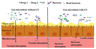 | Fig. 4. Modulation of gut microbiota. CS interacts with the gut bacteria and inhibits the activation of certain prodrugs, thereby affecting the metabolism and bioavailability of drugs. The image illustrates the influence of CS on gut microbiota and the subsequent effects on drug absorption and metabolism. The left side shows the gut microbiota without CS, where two drugs are being normally absorbed through the mucus layer, enterocytes, and into the bloodstream. The bacteria present appear active and unaffected by CS. The right side of the image presents the gut microbiota with CS. Here, we see CS interacting with the bacteria, causing some to become inactive (dead bacteria) and affecting others, as indicated by dashed lines. The presence of CS leads to decreased absorption of one drug (Drug 1) while increased absorption of another (Drug 2). The mucus layer shows changes in permeability, as indicated by the different directions of the arrows. | |
