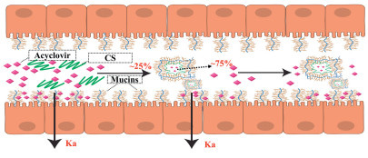 | Fig. 5. Proposed Mechanism of interaction between CS and mucins causing the decreased bioavailability of acyclovir. CS increases mucus viscosity and entraps about 75% of acyclovir in the mucus, reducing the drug’s available concentration for absorption and forming coacervates that hinder its passage to the intestinal wall. Only about 25% of acyclovir approaches the wall for potential absorption. | |