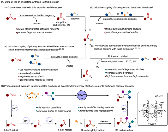 We propose a photo-mediated hydrogen transfer strategy for the synthesis of thioesters from primary alcohols, elemental sulfur and alkenes (Fig. 1B). This method offers a greener and more sustainable approach by using readily available and non-toxic sulfur source, which is abundance, non-toxicity, high-stability, and odourless, especially given the global growing surplus of elemental sulfur [24-33]. Recent studies have shown that elemental sulfur can be activated and participate in radical reactions under photocatalytic conditions for the synthesis of sulfur-containing molecules [28-33]. Notably, thioesters can be obtained from the coupling of alkenes with carbonyl thiyl radicals, which are generated by reacting elemental sulfur with acyl radicals derived from α-ketoacids or aldehydes [32,33]. We envisioned that primary alcohols could generate acyl radical via consecutive photo-mediated hydrogen atom transfer (HAT), proceeding through an aldehyde intermediate. Photo-HAT has proven effective for selectively activating α-hydroxy C—H bonds in alcohols, forming ketyl radical (Ⅰ) that can undergo various radical transformations [34-36]. Primary alcohols can thereof undergo hydrogen transfer to form aldehydes [37-39], which are more accessible for photo-HAT, producing acyl radical (Ⅱ) [40-43]. Subsequently, acyl radical (Ⅱ) can react with elemental sulfur, generating carbonyl thiyl radical (Ⅲ), which then add to alkenes, yielding thioesters. Herein, we describe the photocatalyzed hydrogen transfer enabled synthesis of thioesters from primary alcohols, elemental sulfur and alkenes. This method, employing robust tetrabutylammonium decatungstate (TBADT) as the photocatalyst, operates under mild conditions, accommodates a wide range of primary alcohols and alkenes, and demonstrates high functional group tolerance. However, the method still has room for improvement, particularly regarding the use of the high molecular weight photocatalyst and the excess amounts of alcohol and elemental sulfur.