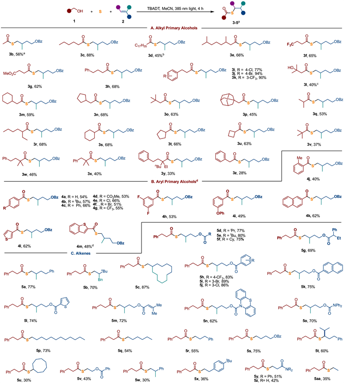 | Fig. 2. Substrate scope of alcohols. Conditions: 1 (3.5 equiv.), S (3.6 equiv.), 2 (0.25 mmol, 1.0 equiv.), TBADT (5 mol%), CH3CN (0.5 mL), LEDs (2 W, 385 nm) irradiation for 4 h at 35–40 ℃, isolated yields. a 1 (5.0 equiv.). b CH3CN (1.0 mL). c 1 (1.5 equiv.). d 8 h reaction. | |