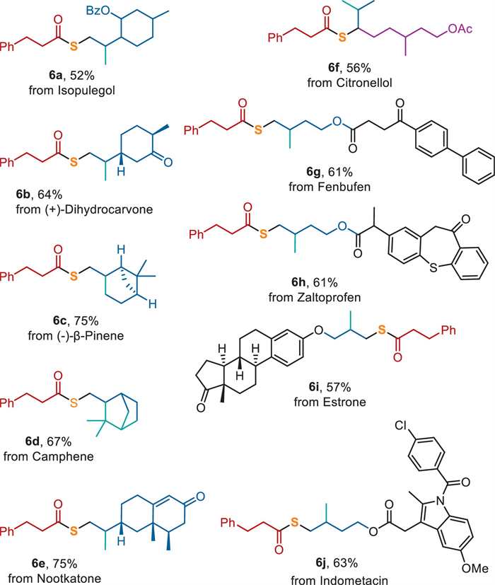 To demonstrate the synthetic utility of this methodology, we applied it to the late-stage functionalization of complex natural products and pharmaceuticals (Fig. 3). Natural products containing olefin functionality, such as (-)-isopulegol, (+)-dihydrocarvone, (-)-β-pinene, camphene, nootkatone, and citronellol all reacted smoothly with 3-phenylproponol (1a) and sulfur, producing the desired thioester (6a-6f) with high chemo- and regioselectivity. In cases, where two alkene units were present, the reaction preferentially targeted the electron-rich and less sterically hindered alkene (6e). Notably, the tri-substituted alkene in cetronellol also underwent the transformation efficiently (6f). Similarly, alkene derived from pharmaceutical molecules, such as fenbufen, zaltoprofen, estrone, and indomethacin, were successfully incorporated into the reaction, demonstrating high chemo- and regioselectivity for thioester formation (6g-6j). These results highlight the versatility of this approach in functionalizing complex molecules, offering a valuable tool for the late-stage modification of bioactive compounds.