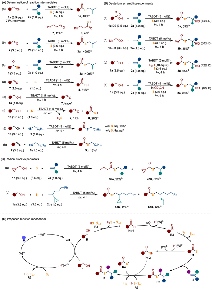 A series of mechanistic experiments were conducted to elucidate the reaction mechanism (Figs. 4A–C). The reaction involving 3-phenylpropanol (1a), elemental sulfur and alkene 2a was deliberately stopped at an early stage to identify potential intermediates (Fig. 4A, a). Analysis of the reaction mixture revealed that 15% of 1a was converted to 3-phenylpropanal (7, 11%) and thiocarboxylic acid (8, 4%), with t thioester 3a forming at 40% yield. When aldehyde 7 was subjected to the same reaction conditions with sulfur and 2a, it underwent complete conversion to thioester 3a (Fig. 4A, b), as did thiocarboxylic acid 8 (Fig. 4A, c). These results indicate that aldehyde and thiocarboxylic acid are key intermediates in the reaction.