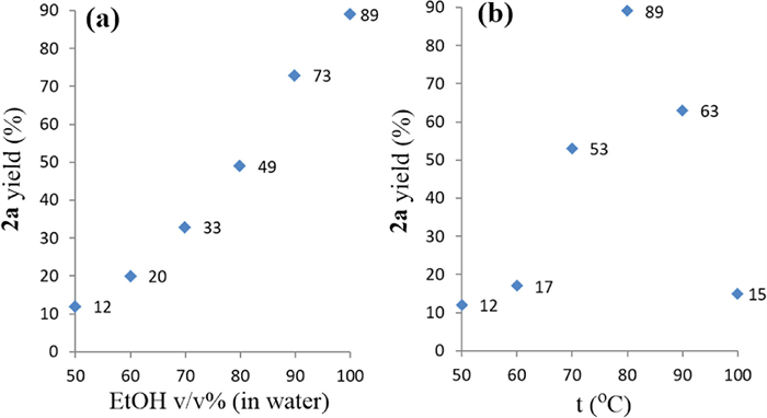 Subsequent investigations focused on the influence of reaction solvent and temperature (Fig. 1). Catalyzed by Se/C (5 mg for the 1 mmol-scale reaction, see Table 2, entry 4), the reaction in 50% aqueous EtOH (volume concentration) produced 2a in only 12% yield (Fig. 1a). The yield of 2a gradually increased with higher EtOH concentrations, and the reaction in pure EtOH led to the highest yield of 2a at 89% (Fig. 1a). As shown in Fig. 1b, the reaction at 50–60 ℃ produced 2a in very low yield. The product yield increased significantly to 53% at a higher reaction temperature. The reaction at 80 ℃ resulted in the highest product yield, while further increases in temperature reduced the yield and led to the formation of numerous unidentified by-products being observed in the thin-layer chromatography (TLC) analysis.
