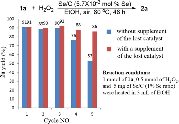 As a heterogeneous catalyst, Se/C could be removed from the reaction mixture via centrifuge separation. The recycled catalyst was tested in the next turn of the oxidative deoximation reaction of 1a (Fig. 2, blue bars). Its catalytic activity was well retained in the first 3 runs of reaction, while the product yield began to decrease in the fourth turn of reaction. 2a was obtained in only 53% yield in the fifth turn. Fortunately, it was found that after an addition of the lost weight of catalyst, the decrease of the product yield was obviously relieved (Fig. 2, red bars), indicating that the declines of the product yield were mainly caused by the loss of ca. 10% of Se/C during the centrifuge separation process.