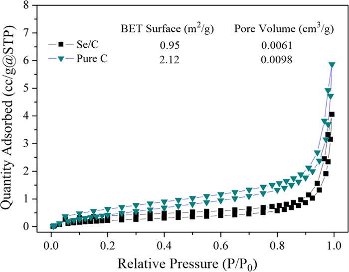 | Fig. 3. N2 adsorption-desorption isotherms of Se/C and pure C (fabricated by calcining glucose under the same conditions). | |
