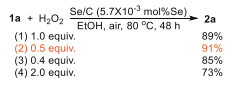 Since the catalytic Se species might be oxidized by molecular oxygen in open air, we explored reducing the amount of H2O2 to lower the reaction cost. Interestingly, the product yield slightly improved with less H2O2 (Eq. 1, entry 2 vs. 1). The optimal condition was identified as using 0.5 equiv. of H2O2, with air potentially acting as a partial oxidant during the process (Eq. 1, entry 2 vs. 1,3). Reducing the H2O2 amount not only lowers down the costs but also enhances the safety of the reaction, particularly during post-reaction processing. Tests with starch potassium iodide (SSKI oral solution) paper confirmed that no peroxide residues left after reaction for the cases using insufficient H2O2. This makes the subsequent product isolation procedure safer, especially for large-scale preparations. Conversely, excess H2O2 led to the formation of numerous by-products, significantly reducing the yield of the desired ketone (Eq. 1, entry 4).