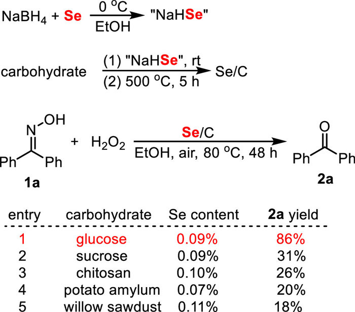Carbohydrates are inexpensive and abundant biomasses produced globally on a large scale each year. Beyond their traditional use in the food industry, carbohydrates serve as bulk starting materials for the production of numerous industrially important chemicals, such as ethanol, glycerol, sorbitol, succinic acid, and diformylfurans. These compounds are widely utilized as solvents, fuels, synthetic intermediates, and monomers for polyester fiber production [24,25]. As renewable resources, carbohydrates hold significant potential for industrial applications, making the development of technologies for their utilization a key focus in sustainable chemistry research. It has been reported that, by treating carbohydrates with NaHSe and calcining the obtained selenized carbohydrates at over 500 ℃, a novel biomaterial Se/C could be fabricated [26-28]. Recently, we discovered that this material can effectively catalyze oxidative deoximation reactions, a critical transformation in the total synthesis of natural products like erythronolide A [29] and fine chemicals such as the spice carvone [30]. Unlike conventional organoselenium-catalyzed systems [14-23], this catalyst operates via unique free radical mechanisms, delivering remarkable reactivity and achieving turnover numbers (TONs) surpassing 104. Herein, we wish to report our findings.