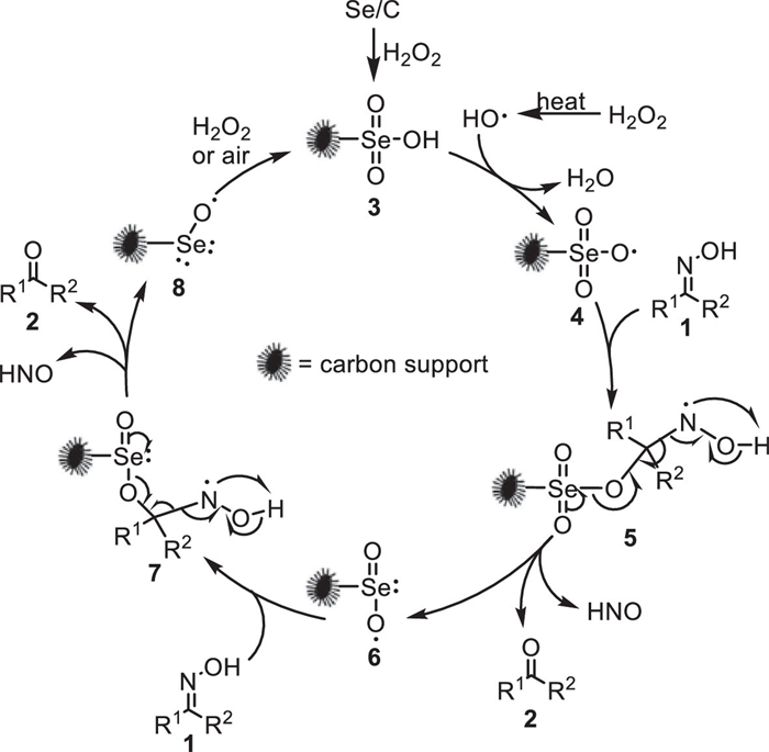 Based on the above experimental results as well as reference reports, a plausible mechanism of this Se/C-catalyzed oxidative deoximation reaction was supposed (Scheme 2). Se in Se/C was initially oxidized by H2O2 into Se(Ⅵ) species 3 [39]. The reaction of 3 with free radicals, such as the hydroxyl radical generated via the thermal homo-cleavage of H2O2, might afford the active free radical 4, which soon reacted with the oximes 1 to produce the intermediate 5 [40,41]. The decomposition of 5 resulted in the removal of the oxime group, releasing HNO as a by-product, while transferring oxygen from the catalytic Se species to the carbon, ultimately forming the carbonyl group in 2 [40,41]. Simultaneously, Se(Ⅵ) in catalyst was reduced into the Se(Ⅳ) species 6 [39]. As attested by XPS analysis in our previous works, the HNO by-product could be oxidized into the stable nitrate after reaction [40,41]. The highly active Se(Ⅳ) species 6 reacted with aldoxime 1 to form 7 quickly and restarted another deoximation process to produce carbonyl 2 [17,18], while the Se(Ⅳ) was further reduced to the free radical 8. Oxidation of 8 by H2O2 or air regenerated the catalytic species 3, which participated the next turn of catalysis circle. The Se/C-catalyzed reactions occurred via a free radical mechanism instead of the previously reported ionic reaction (Table 4, entry 1) [17,18]. The high reactivity of the free radical species enabled their efficient addition to oximes (4 to 5, 6 to 7 in Scheme 2), which underscores the high catalytic activity of Se/C, as evidenced by its impressive turnover numbers (TONs).