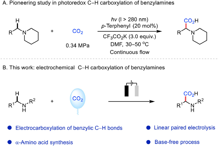 Natural and unnatural α-amino acids find broad application in both academic research and industrial domains, particularly in pharmaceutical, biotechnology, and chemical sectors [74-80]. Traditional chemical methods for synthesizing α-amino acids mainly involve the Strecker and Gabriel syntheses, which generally require harsh reaction conditions and employ highly toxic reagents such as hydrogen cyanide (HCN) or hydrazine [75,77]. These drawbacks undoubtedly increase production costs, reduce reaction efficiency, and exacerbate environmental pollution. Of note, pioneering contributions to achieve carboxylation of benzylic C—H bonds date back to 2017, when Jamison and co-workers developed the photoredox carboxylation of tertiary N-benzylpiperidines to obtain α-amino acids (Fig. 1A) [81]. Several tertiary benzylamines could undergo carboxylation using ultraviolet light irradiation with 20 mol% p-terphenyl as the photocatalyst, 3 equiv. potassium trifluoroacetate (CF3CO2K) as the base and 0.34 MPa CO2 as the carboxyl source. Inspired by this elegant work and our continuous interest in electrochemical carboxylation [82-85], we envisioned that direct electrochemical benzylic C—H carboxylation of benzylamines could serve as an ideal approach to α-amino acids, combining enhanced atom economy with significantly improved reaction efficiency. This methodology represents a more sustainable and efficient alternative to conventional synthetic approaches, fully consistent with green chemistry principles. However, notable challenges include (i) how to solve the problems caused by paired electrolysis that benzylamines favor anodic reactions [86-88] while carboxylation usually occurs at the cathode [82-85] (ii) how to reach the relatively high oxidative potential of benzylamines and activate the inert CO2 molecule simultaneously; and (iii) how to achieve late-stage modification of benzylic C—H bonds of amines in a smooth manner. 2,3-Dichloro-5,6-dicyano-1,4-benzoquinone (DDQ) proves to be an electrochemical oxidation catalyst for amines [89]. Thus, we considered it could promote this reaction efficiently.