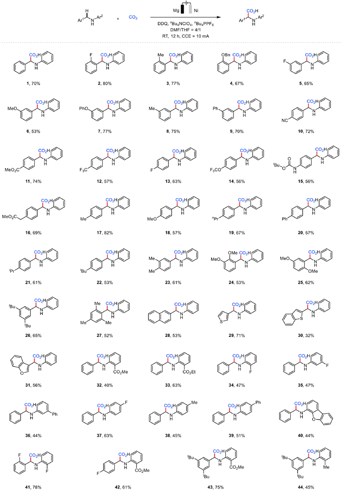 We started our investigation on electrocarboxylation of benzylic C—H bonds using N-phenylbenzylamine 1a as the model substrate (Table 1). After careful optimization, the corresponding carboxylation product 1 could be obtained in 70% isolated yield when the following conditions were employed: DDQ (0.75 equiv.), nBu4NClO4/nBu4PPF6 = 1/1 as the mixed electrolyte, DMF/THF = 4/1 as the mixed solvent and cheap Mg plate and Ni plate as working electrodes with a constant current at 10 mA, using an undivided cell for 12 h at ambient temperature (Table 1, entry 1). Control experiments were conducted thereafter. According to the results, no reaction would occur without the electrical input, highlighting that it is an electro-assisted carboxylation (Table 1, entry 2). The significant inhibition of electrochemical performance and poor substrate consumption in the absence of DDQ clearly demonstrates its crucial role in promoting this reaction (Table 1, entry 3). Using nBu4PPF6 or nBu4NClO4 as the sole electrolyte would cause a high reaction voltage, which resulted in lower yields (Table 1, entries 4 and 5). Other common electrolytes, such as nBu4NBF4 and nBu4NBr were also tested, affording 1 in 21% and 34% yields, respectively (Table 1, entries 6 and 7). These studies demonstrated that an equal combination of nBu4PPF6 and nBu4NClO4 was the optimal electrolyte for this electrocarboxylation reaction. Compared to other types of ratios or solvents, a mixed solvent with DMF/THF = 4/1 exhibited the best-observed reactivity (Table 1, entries 8–11). Pt, GF and Pb were suitable cathodes for this electrosynthesis (Table 1, entry 12). Then, different active anodes, such as Al and Zn delivered the desired product in much lower yields (Table 1, entry 13). The inert GF anode was also investigated, but resulted primarily in unreacted starting material with only trace imine formation. Finally, increasing or decreasing the current was not conducive to the reaction (Table 1, entries 14 and 15).